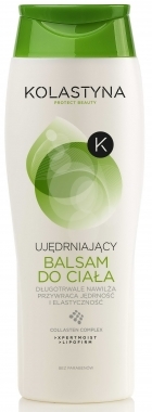 Бальзам для тела, повышающий упргугость кожи надолго увлажняет, восстанавливает упругость и эластичность. Не содержит парабенов. Состав: COLLASTEN COMPLEX (R), Xpertmoist, Lipofirm. Верните утраченную упругость и эластичность кожи с помощью укрепляющего бальзама KOLASTYNA. Благодаря эффективному сочетанию активных ингредиентов, легко впитывающаяся формула увлажняет и укрепляет кожу. Уникальный комплекс коллагена, эластина и гликогена улучшает процесс поступления кислорода в клетки кожи и их метаболизм. Xpertmoist обеспечивает длительный увлажняющий эффект. Комплекс натуральных ингредиентов LIPOFIRM восстанавливает правильную структуру коллагеновых волокон, стимулирует и регулирует кровообращение. В результате, кожа становится более упругой и подтянутой!